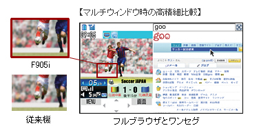 ワンセグ起動中でも、フルブラウザやiモード®といった他の機能を「ながら操作」できるマルチウィンドウを採用しました。さらにF905iなら、マルチウィンドウ時画面でもワンセグを美しく表示。字幕表示も鮮明に表示するうえ、字幕フォントには視覚工学に基づいた「Uni-Type®」を採用。また、視聴中の番組をキャプチャすれば、美しい静止画として保存することもできます。