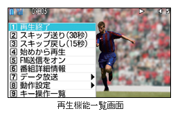電話着信時に視聴中の番組を蓄積し、あとで追っかけ早見再生ができるタイムシフト再生(注4)をはじめ、録画番組の早送り/巻き戻し、手軽な操作で行えるスキップ送り/スキップ戻し、レジューム再生などさまざまな再生機能に対応。レジュームとは、いちど停止した箇所から再生場面を始められる便利機能。多彩な再生機能で、ワンセグをよりいっそう楽しめます。