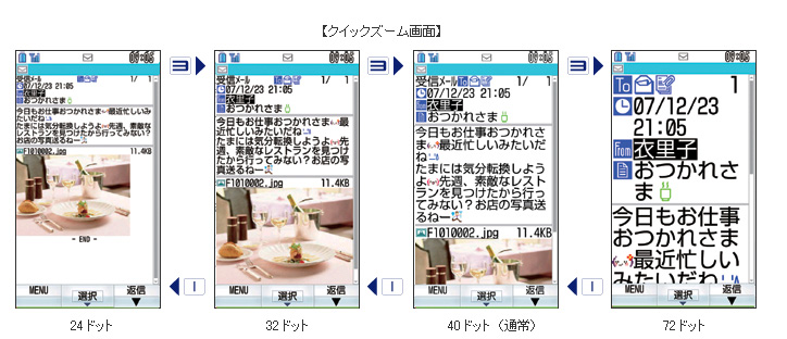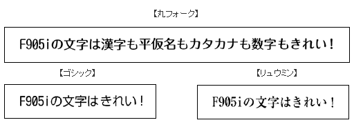 F902iから好評のリュウミンに加え、上品さと見やすさのバランスがとれた「丸フォーク」フォントを追加しました。ディスプレイが高精細になり、既存のゴシックやリュウミンもさらに美しく表示します。