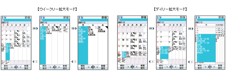 スケジュールのマンスリー画面から、確認したい週や日時画面へと手軽な操作で拡大・縮小することができます(1キー:縮小、3キー:拡大)。ウイークリー拡大モードは4段階、デイリー拡大モードは7段階の拡縮が可能。これにより、特定の日に予定が集中していても開始時間などをスピーディーに確認することができるので、忙しいビジネスパーソンなどに最適です。