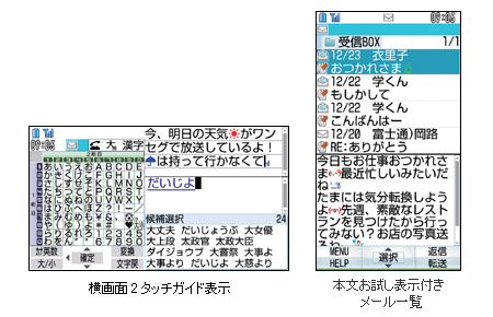 メール早打ちユーザーに根強い人気の2タッチ入力に対応しました。横画面2タッチガイド表示にも対応しているので、ガイドを見ながら手軽に文字の入力が可能です(注5)。また、受信メール一覧画面でメール本文をチェックできる「本文お試し表示付きメール一覧画面」を採用。本文の拡縮も行えるので便利です。