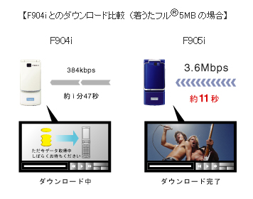 F905iは、FOMAハイスピード対応。従来の10倍の速度である受信最大3.6Mbpsの高速パケット通信が可能(注8)。フルブラウザも大容量コンテンツのダウンロードもサクサク快適です。