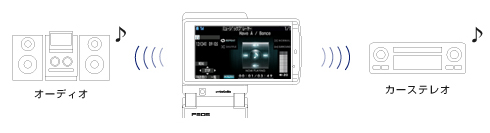 ケータイに入っているWMAの音楽データや、着うたフル®、ワンセグの音声などを、カーステレオやFMラジオを使って、ワイヤレスで楽しむことができます。また、Music&Videoチャネル™の音楽番組もFM送信が可能です。