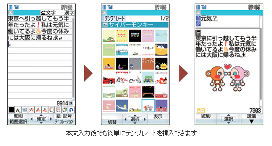 メール本文入力中に、デコメールテンプレートを呼び出すことができます。たとえば、本文を作成してしまった後にテンプレートを利用したくなった場合も簡単に挿入できるので、より快適にデコメールテンプレートを使いこなせます。