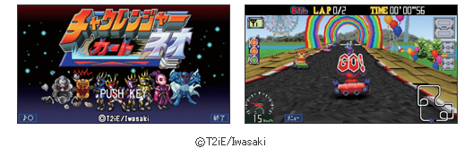 ケータイを「かたむける」などの直感的な操作でゲームが楽しめます。F905iは、そんな直感ゲーム™対応の「チャクレンジャーカート ネオ」をプリインストール。キャラクターと対戦して順位を競ったり、走行タイムを記録するカーレースゲームです。