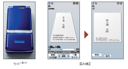 有効約320万画素カメラに、自動手ぶれ補正や、オートフォーカス、ライト(注11)、歪み補正などの便利な機能を搭載しました。さらに、本格デジタル一眼レフカメラに使われている画像処理エンジンMilbeaut®(ミルビュー)を継承。ハイクオリティな撮影が手軽に楽しめます。