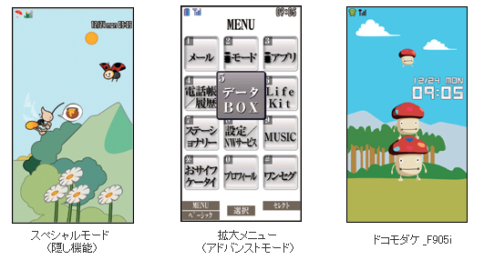 F905iの各カラーに合わせたメニューカスタマイズに加え、見やすい拡大メニュー(アドバンストモード)、キャラクター画面などをiモードからダウンロードしてケータイを彩れる多彩なきせかえツール®をご用意。さらに、Fならではのスペシャルモード(隠し機能)も楽しめます。