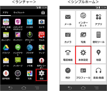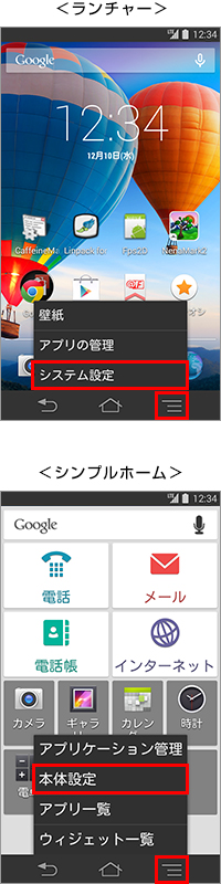 ホーム画面下部にある[ナビゲーションバー]の[メニューアイコン]をタップし、表示された一覧から「システム設定」(シンプルホームは「本体設定」)をタップして、手順3へ進むこともできます。