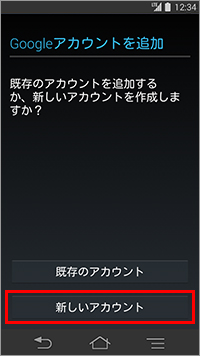 5. 「Googleアカウントを追加」が表示されたら、「新しいアカウント」をタップします。