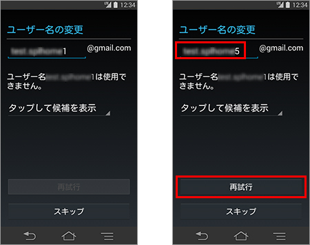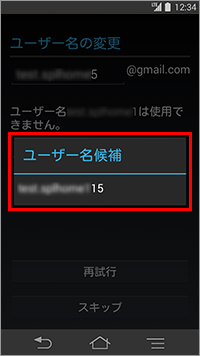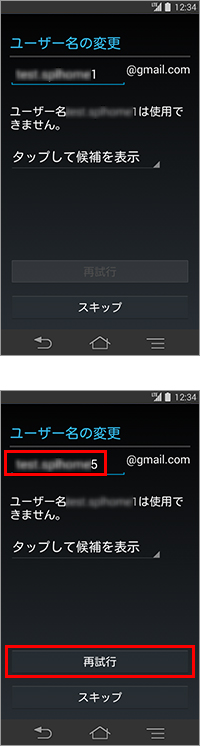 手順7で入力したGmailアドレスがすでに第三者に取得されている場合、「ユーザー名の変更」が表示されるので、別のユーザー名を入力後「再試行」をタップします。