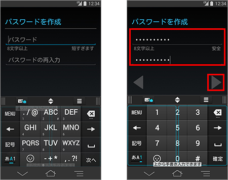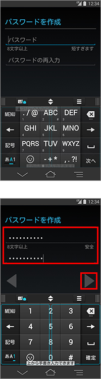 9. 「パスワードを作成」が表示されたら、8文字以上の任意のパスワードを「パスワード」に入力し、同様のパスワードを「パスワードの再入力」に入力して、「