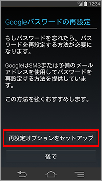 10. 「Googleパスワードの再設定」が表示されたら、「再設定オプションをセットアップ」をタップします。