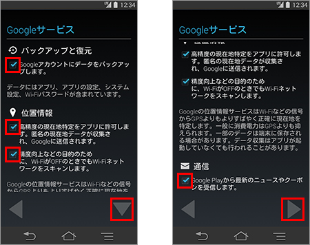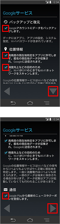 12. 「Googleサービス」が表示されたら、各項目それぞれについて同意しチェックを入れるか、チェックを外すかのいずれかをタップして選択し、「