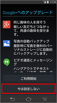 17. 「Google+へのアップグレード」が表示されたら、「ご利用開始」か「今は設定しない」のいずれかをタップします。ここでは例として、「今は設定しない」をタップします。