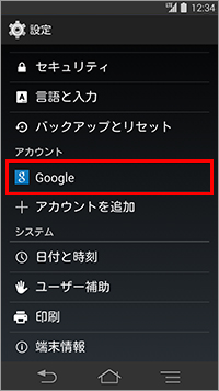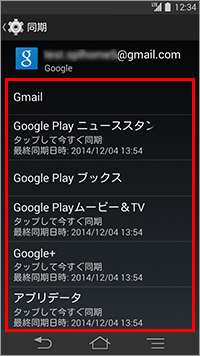 手順20でGoogleアカウントをタップすると、さきほど設定した「同期」が表示され、Googleサービスの各項目についてアカウントを同期するかどうかを設定することができます。