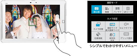 シンプルなメニューで、誰でもカンタンに撮影ができます。撮影後の閲覧も指を左へフリックさせるだけの、わかりやすい操作です。