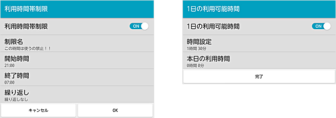 お子様の利用できない時間の設定ができるので、夜間や早朝などの利用を禁止できます。また、1日の利用上限時間を設定して使いすぎを防止することもできます。