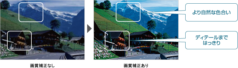 ギャラリー内の静止画やYouTube™など、表示する画像や映像に合わせて、色合いや輪郭の補正、超解像処理がされるので、より自然な印象、緻密な描写でコンテンツを美しく表示できます。