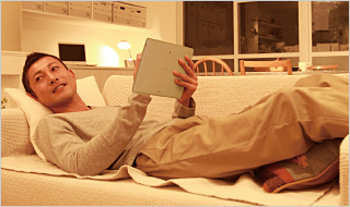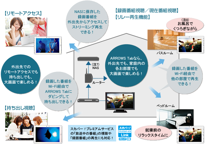 対応の機器に録画した地デジ番組(注6)を、Wi-Fiを介してリビング以外の部屋で視聴したり、外に持ち出すことも可能。タブレットの大画面を活かして、まるで自分専用のテレビのように番組視聴を楽しめます。さらに、専用のNAS(注7)にコンテンツを保存すれば、外出先からリモートアクセスしていつでも視聴することができます。