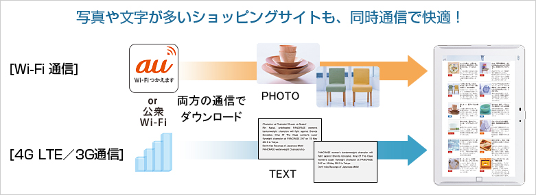 Wi-Fiと4G LTE/3G通信の2つの通信方式を同時に使用するので、快適な通信環境を保てます。たとえば、画像とテキストをそれぞれ別の回線でダウンロードすることで、画面表示が止まることもなく、スムーズに画面表示されます。