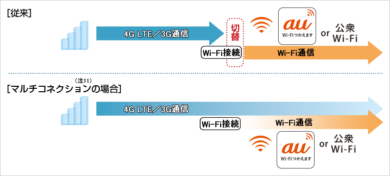 4G LTE/3G接続時にWi-Fiを見つけると、4G LTE/3Gに接続したままWi-Fiに追加接続。途切れにくく安定した通信を保ち、画面表示が止まるイライラを解消します。