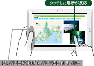 タブレットを持つ時、うっかり画面の端を触ってしまっていても、意図した操作のタッチ部分にのみ反応し、誤作動を防ぎます。
