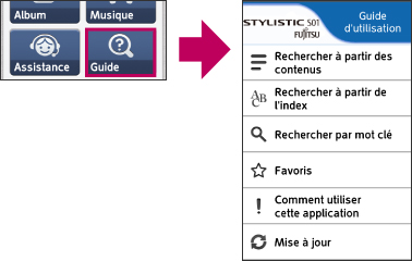 Il est possible de télécharger ou de mettre à jour le mode d'emploi de l'appareil via Internet juste en appuyant sur le bouton « Guide », puis « Mise à jour ». Il est bien pratique d'avoir le mode d'emploi intégré à l'appareil, il devient ainsi disponible à tout moment.