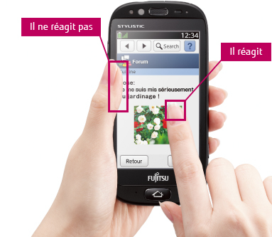 En tenant l'appareil, vos mains peuvent venir toucher l'écran par erreur, mais l'appareil n'en tiendra pas compte. En effet les contacts de votre main avec l'écran, volontaires ou accidentels, sont analysés et distingués automatiquement. On peut vraiment tenir son STYLISTIC S01 fermement, bien en main, sans craindre une erreur de manipulation.