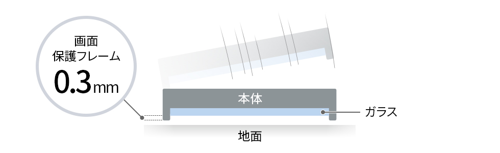 画面周囲に0.3mmのフチを立て、落下時にも画面が直接地面に当たりにくくなります。