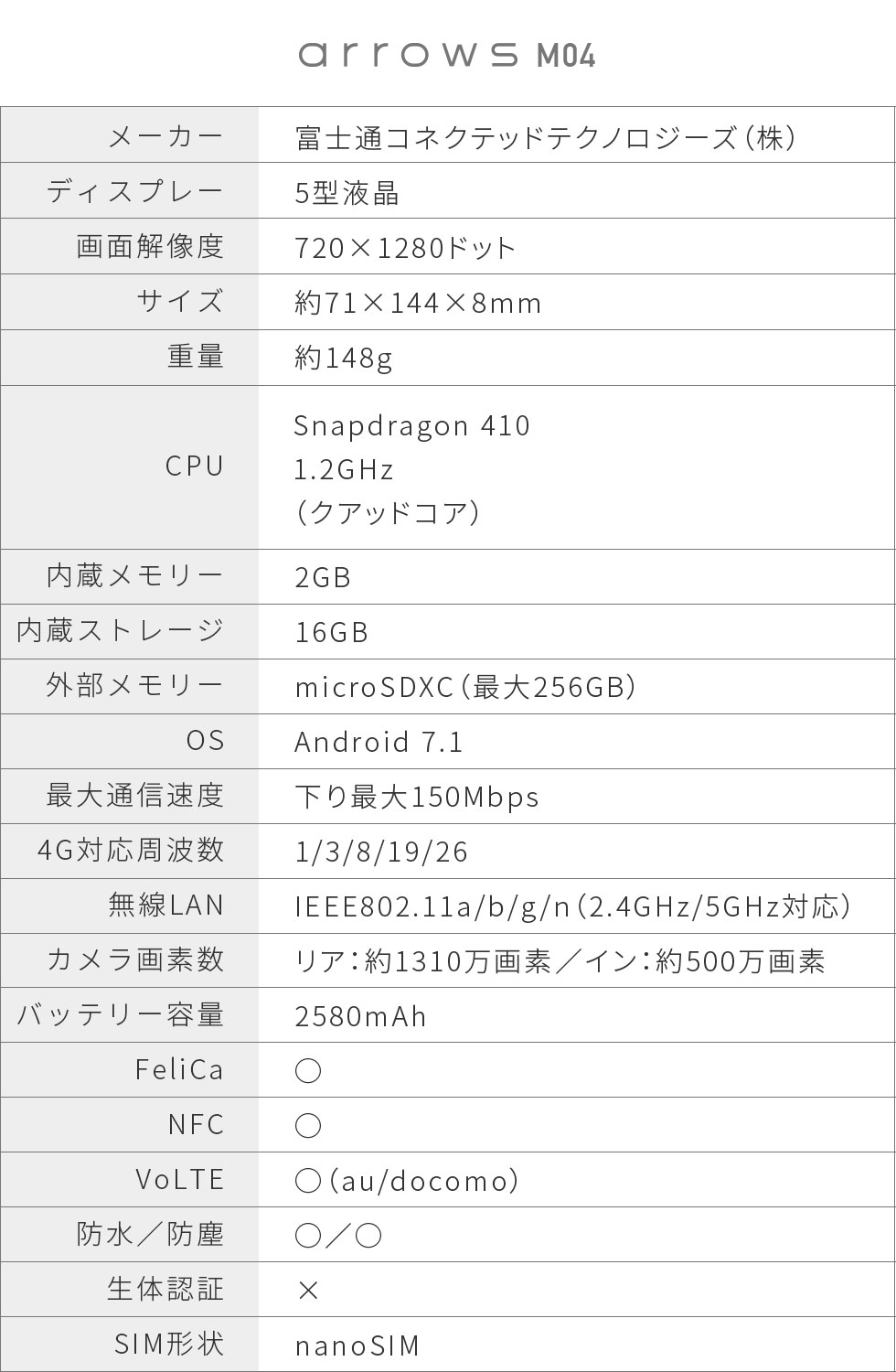 arrows M04は5型(720×1280ドット)のIPS液晶を搭載し、CPUはSnapdragon 410(1.2GHz、クアッドコア)を採用。メモリーは2GB、内蔵ストレージは16GBで、いわゆるミドルレンジにあたるスペックとなっている。