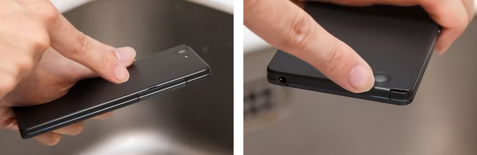 洗う前に本体の電源を落とし、左側面のnano SIM/microSDスロットのキャップとTVアンテナがキッチリとしまってあるかチェック