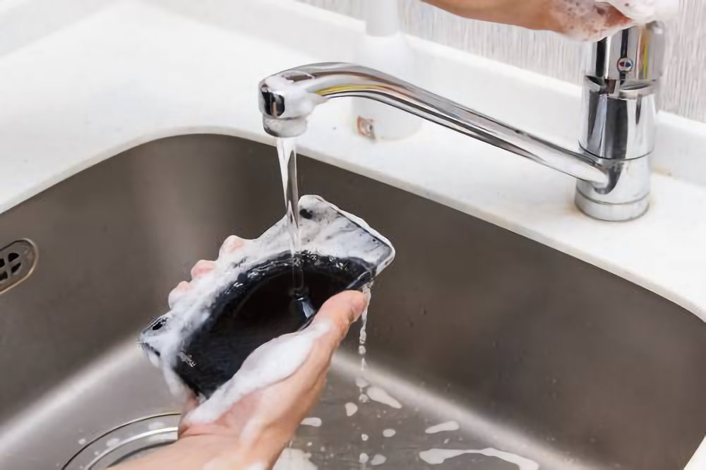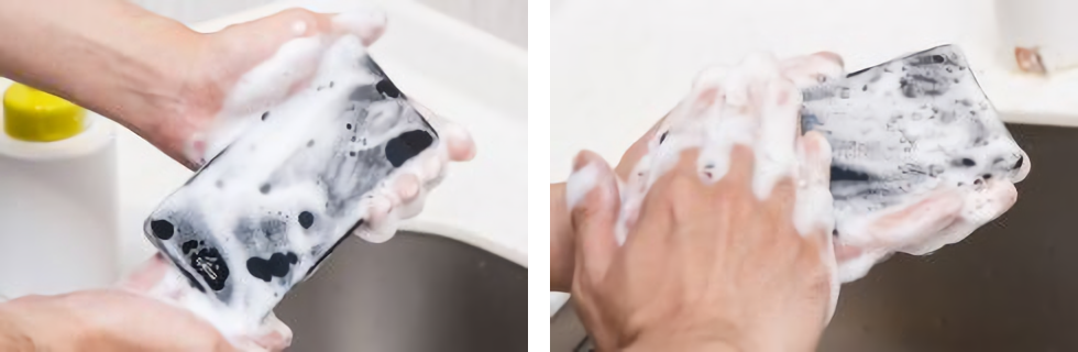 洗い方は、まず泡タイプのハンドソープを手に取ってしっかりと泡立てる。そのあとスマートフォンを手に取って、汚れを浮かせるように泡でこするように洗う。次に各面の泡がなくなるように水道の水で流せばオーケー。イヤホンジャックに水が入っても問題なし。