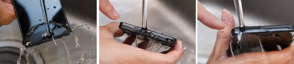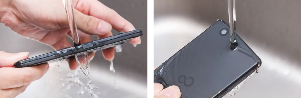 これだけタフネスなスマートフォンなので、アウトドアでもガッチリ使いたいところ。そうなると気になるのが汚れへの対策だ。その点arrows M04はIPX5/8準拠の防水だけでなく、耐洗剤にも対応。泥や脂で汚れた手で操作したあとに、市販の泡タイプのハンドソープで丸洗い可能。いつまでもキレイで清潔に保つことができるのだ。