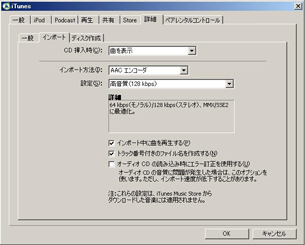 初めてインポートするときは、「編集」→「設定」→「インポート」で、インポート方法を「AACエンコーダ」に設定します。「設定」をカスタムにした場合、ビットレートを16〜128Kbpsの間で自由に選択可能。数値が大きいほど音質がよくなるが、データも大きくなります。