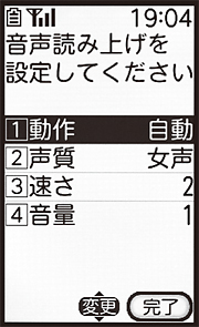 音声読み上げを設定する]を選び、自動的に読み上げるかどうか、声質、速さなどを設定し、