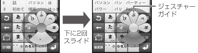 | ジェスチャーガイド(注1) | ジェスチャー入力Pro設定中に、チェックを外して「OK」をタップすると、ジェスチャーガイドが表示されなくなります。 チェックを付けると、キーをタップしてからジェスチャーガイドが表示されるまでの時間を設定できます。 |