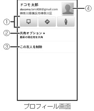 地図上で友人の写真アイコンをタップして吹き出しをタップするか、Latitudeの友人リストで友人をタップして、友人のプロフィールを開きます。プロフィール画面で以下の操作ができます。