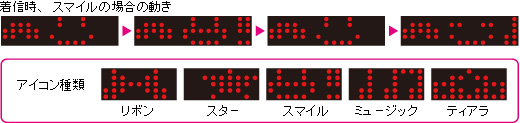 サブディスプレイに、時刻や着信相手の名前を表示。さらに、秘密にしたい着信相手は可愛いアイコンでさりげなく表示してくれます。アイコンバリエーションは10種類用意しました。