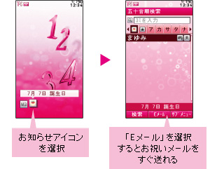 アドレス帳に登録された誕生日を、当日に待受画面でお知らせ。そのお友だちへのバースデーメールもすぐに作成できます。