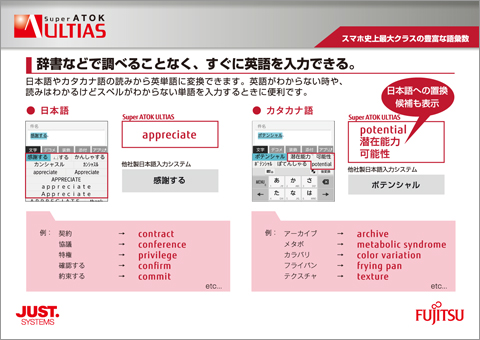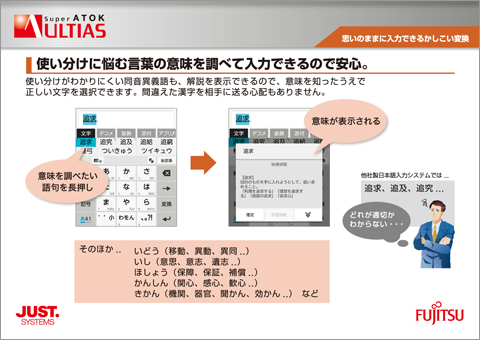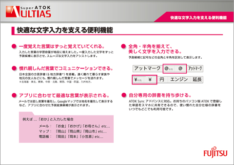 富士通株式会社と株式会社ジャストシステムで、これまでにない最高レベルの文字変換を実現した日本語入力システム「Super ATOK ULTIAS(スーパー エイトック ウルティアス)」を共同で開発。