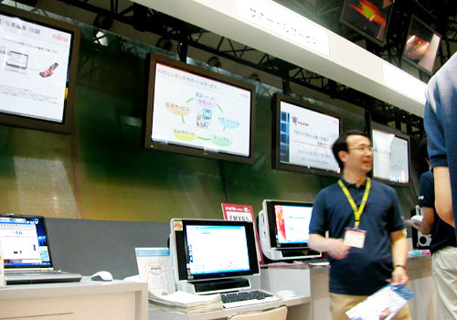 こちらでは、ステージでのプレゼンテーションと呼応する形で、富士通が誇る「サポート&サービス」についてをご説明いたしました。富士通の24時間365日のフルサポートに、深夜のPCトラブルに悩んだご経験のあるお客様などから強い関心をいただきました。また、「日本マニュアルコンテスト 2005」で部門優秀賞を受賞したFMVの電子マニュアル「富士通サービスアシスタント」もここでご紹介させていただきました。