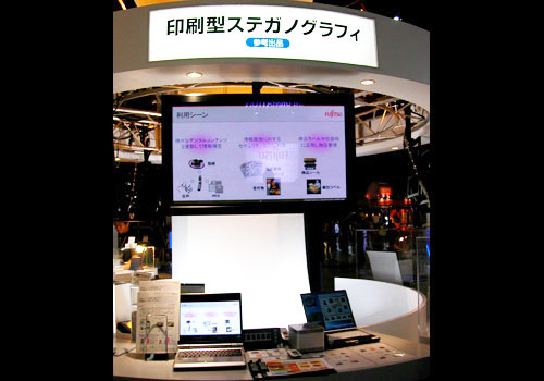 こちらも富士通の先端技術で人気の高いコーナー。発表以来大きな反響を得ているというこの技術は、音声や画像などのデータにメッセージを埋め込む技術。 紙に果汁で字を書いて火にかざすと文字が浮かび上がる「あぶり出し」のデジタル版。従来から開発されてきたステガノグラフィを、はじめて印刷に対応できる形にした所に大きな特徴があり、説明を聴いて、驚かれるお客様も多かったです。