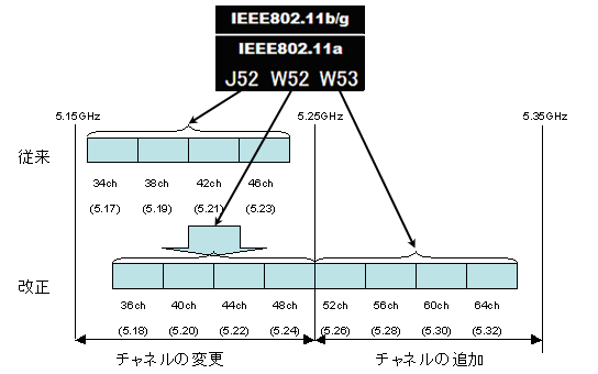 現在使用されている5GHz帯のチャネル4つ(J52)が、中心周波数が10MHzずれて(W52)に変更され、さらに新しいチャネル4つ(W53)が追加となります。計8チャネルとなります(A1の図参照)。異なったチャネル同士の通信はできなくなりますので、新チャネル対応のシステムに切り替えることをお勧めします。