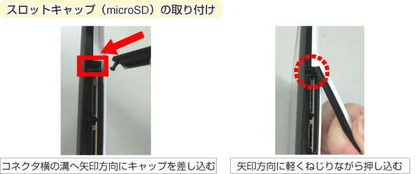 | スロットキャップは、以下の方法で取り付けてください。 コネクタ横の溝にキャップを差し込みます。 軽くねじりながら押し込みます。 ![]() |