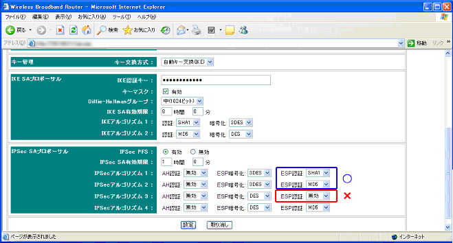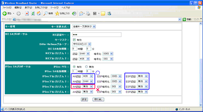 VPNページのIPSec SAプロポーサルの設定において、使用するIPSecアルゴリズムのAH認証をSHA1あるいはMD5にしてください。