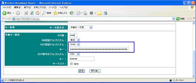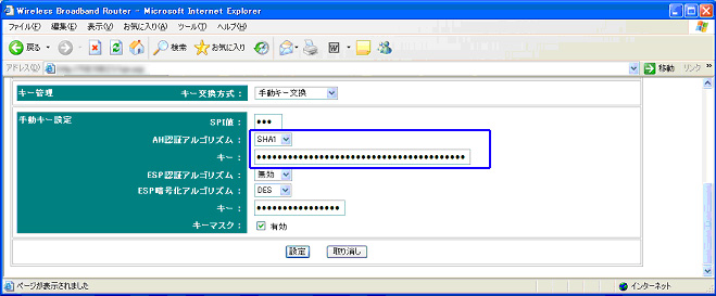 VPNページの手動キー設定において、AH認証アルゴリズムをSHA1かMD5にしてください。