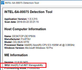 「ME Information」-「SKU」欄に、「Intel(R) Full AMT Manageability」または「Intel(R) Standard Manageability」と表示された場合は、対象です。
