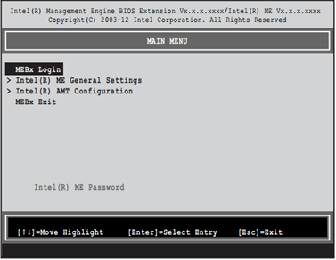 「Intel(R) AMT Configuration」メニューは、搭載CPUにより「Intel(R) Standard Manageability Configuration」メニューに変わる場合があります。 - 手順2でMEセットアップログイン画面がAの場合、「admin」と入力し、 【Enter】キーを押します。Bの場合、「MEBx Login」を選択し、 【Enter】キーを押すと、パスワード入力画面が表示されるので、「admin」と入力し、 【Enter】キーを押します。