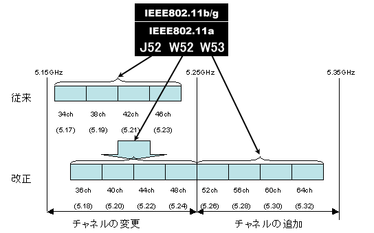 現在使用されている5GHz帯のチャネル4つ(J52)が、中心周波数が10MHzずれて(W52)に変更され、さらに新しいチャネル4つ(W53)が追加となります。 計8チャネルとなります(A1の図参照)。異なったチャネル同士の通信はできなくなりますので、新チャネル対応のシステムに切り替えることをお勧めします。