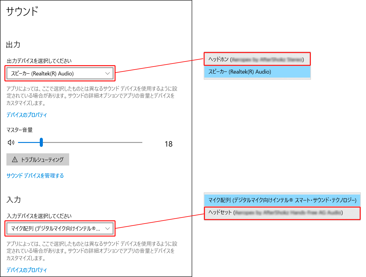 - 出力デバイス、入力デバイスにBluetoothヘッドホンを設定しました。次の項目を行ってください。